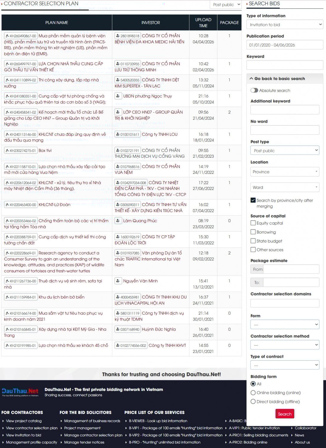 Using the private tender information search software - DauThau.Net, searching becomes easier and more accurate. Especially if you use the private tender information service packages, the system will automatically filter 24/7 and send the found information to your email, saving time, costs, and manpower in searching for and "hunting" for tender information.