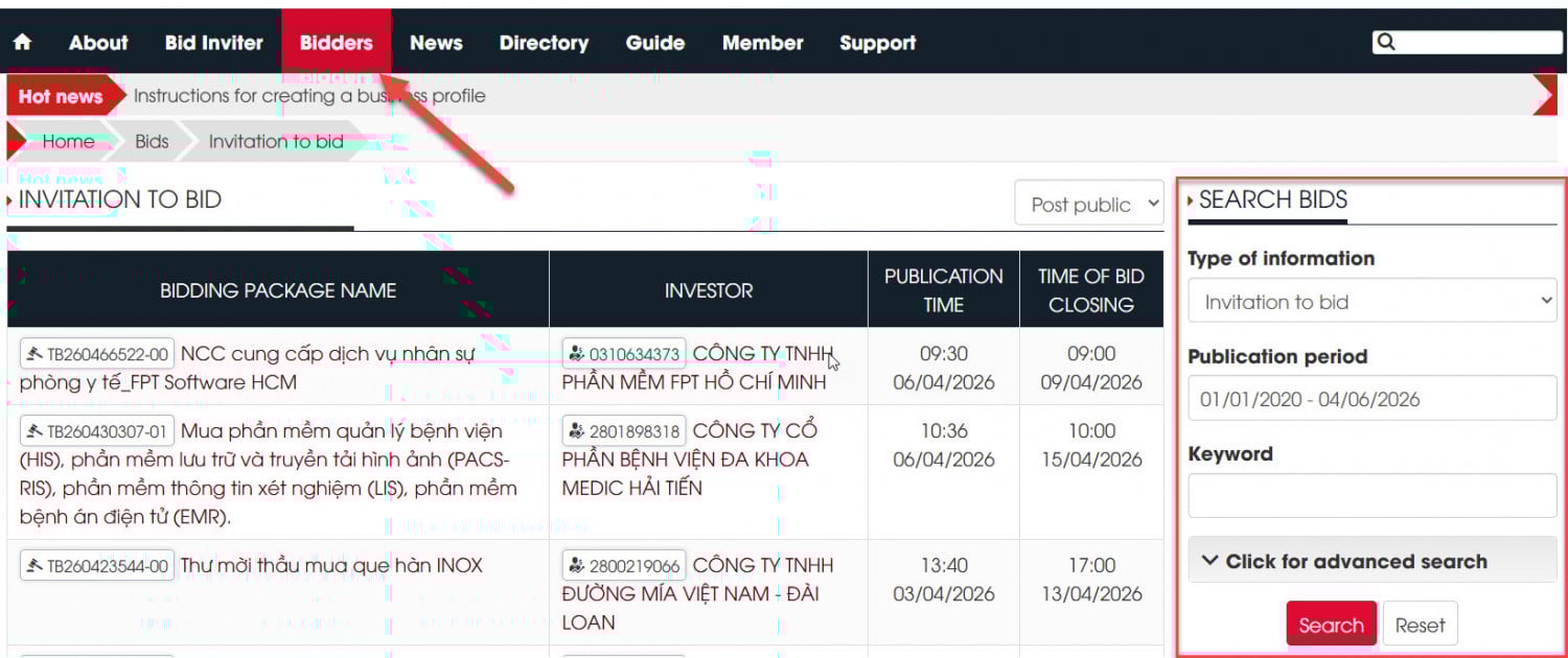 On the Bidders, contractors can use the quick search function to research any information about tender notices or procurement plans.