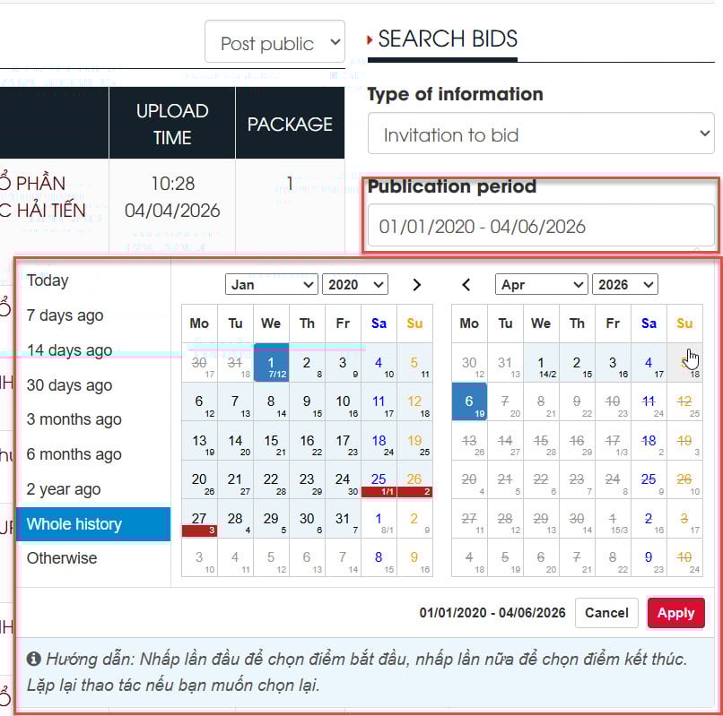 Next, you can filter the information by selecting the time period for which the Invitation to Invitation to bid was posted. Here, you can choose an automatic range from 7 days to the entire search history, or you can select a specific time period by clicking on another option.